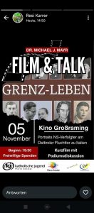 Der Film „Grenz-Leben“ mit berührenden Original-Schilderungen aus der Nazizeit – Widerstand, Verhöre, KZ-Greuel – hat das Publikum in der Ennstaler Gemeinde Großraming spürbar gepackt und war die perfekte Steilvorlage für ein Gespräch über couragiertes Auftreten gegen Missstände sowie für ein besseres Zusammenleben und gerechten Fortschritt heute. Danke an die OrganisatorInnen und an die Teilnehmenden.